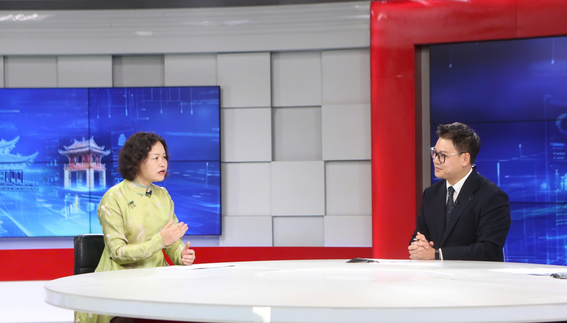 | Hai khách mời tham gia chương trình thời sự tối 5-4. Ảnh: Thanh Hải |