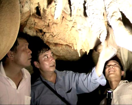 Lãnh đạo huyện, xã Tả Lủng kiểm tra các khối thạch nhũ đá vôi tại một trong nhiều hang động tại xóm.