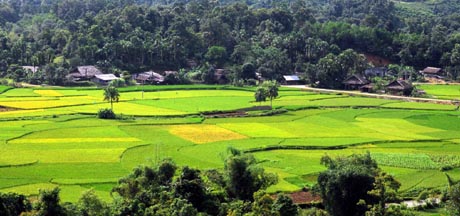 Tại cửa hang Thủng sẽ bao quát được toàn bộ khu vực trung tâm xã Bạch Ngọc với những thửa ruộng lúa nên thơ, đẹp mắt.