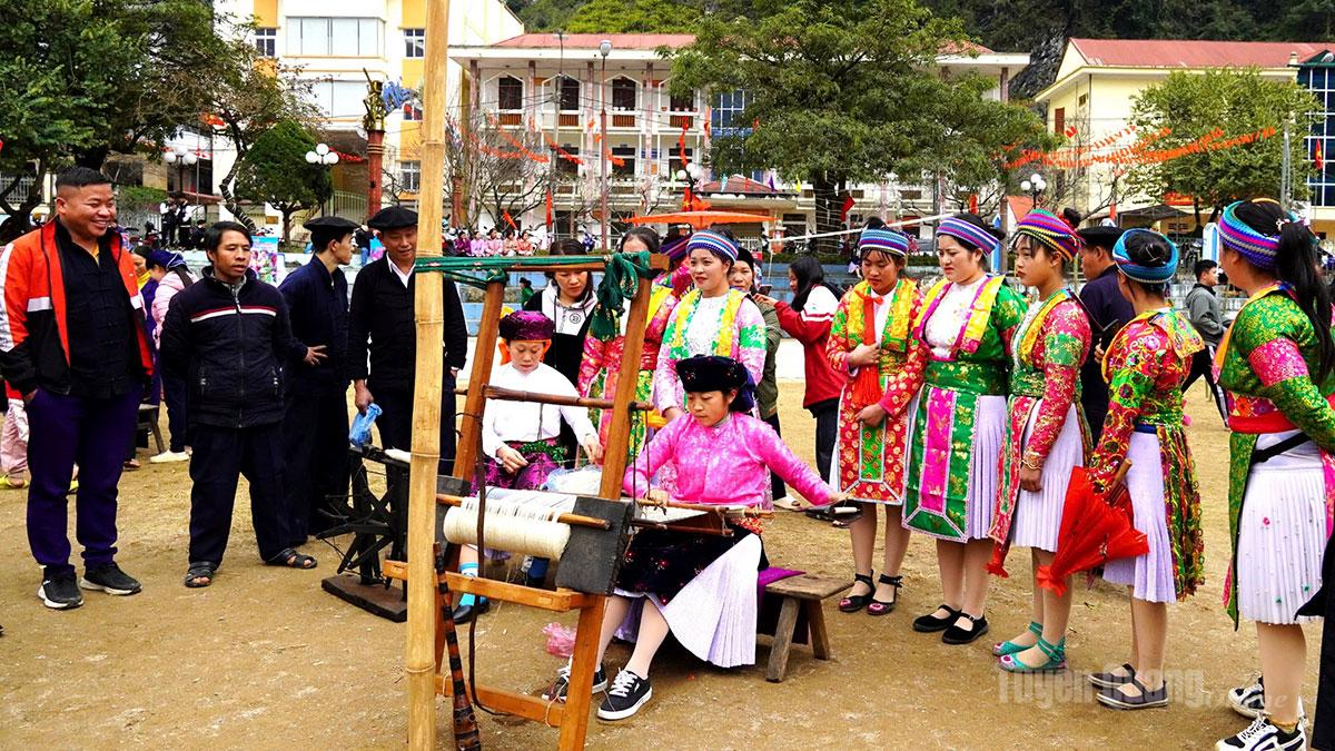 | Đồng bào dân tộc Mông xã Mèo Vạc dệt thổ cẩm, gìn giữ nét đẹp văn hóa dân tộc. |