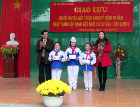HGĐT- Sáng ngày 15.12, trường Tiểu học Kim Đồng (TPHG) phối hợp với Thư viện tỉnh tổ chức Giao lưu và tuyên truyền giới thiệu sách nhân dịp kỷ niệm 70 năm ngày thành lập QĐND Việt Nam (22.12.1944 – 2014). Dự có lãnh đạo Sở Văn hóa – Thể thao và du lịch, Thư viện tỉnh, phòng GD – ĐT thành phố...