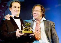 | Đạo diễn Darren Aronofsky và diễn viên chính Mickey Rourke nhận giải Sư tử vàng. |