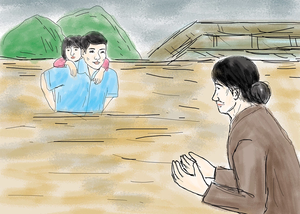 Bà òa khóc nức nở. Cả thân hình run bần bật trong vòng tay con. Trời đất quay cuồng. Bao nhiêu hoảng loạn, sợ hãi vỡ òa thành dòng nước mắt. Bà ghì chặt con, như sợ nó tan biến ngay trong cơn mưa lũ.