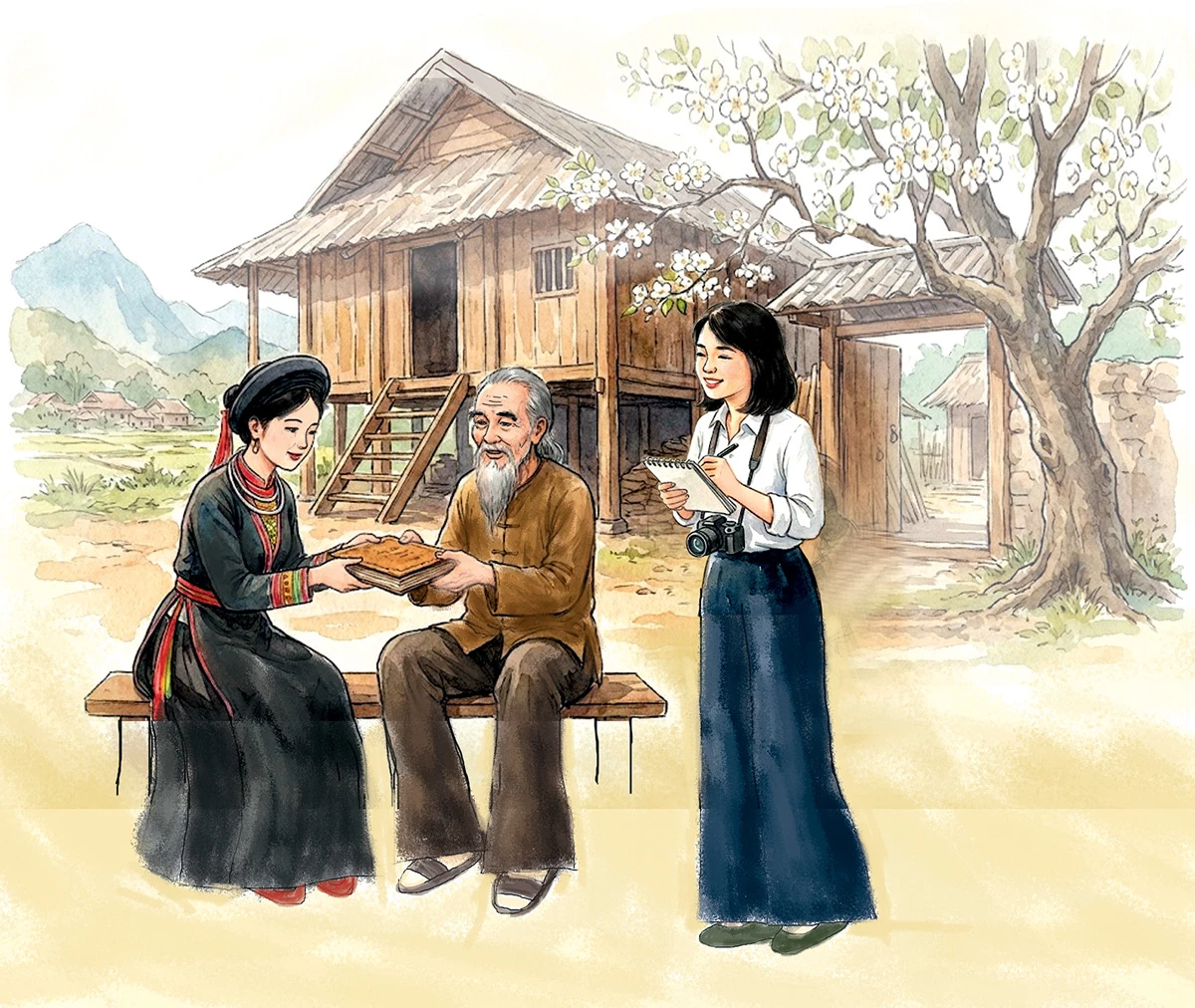 - Ôi chuyện dài lắm cháu. Bác chỉ mong được truyền dạy chữ, được cùng bà con seo lại những tờ giấy dó. Bản sắc lắm cháu ạ. Tiếc rằng có một cuốn sách quý bác để thất lạc. Cháu gắng giúp bác.