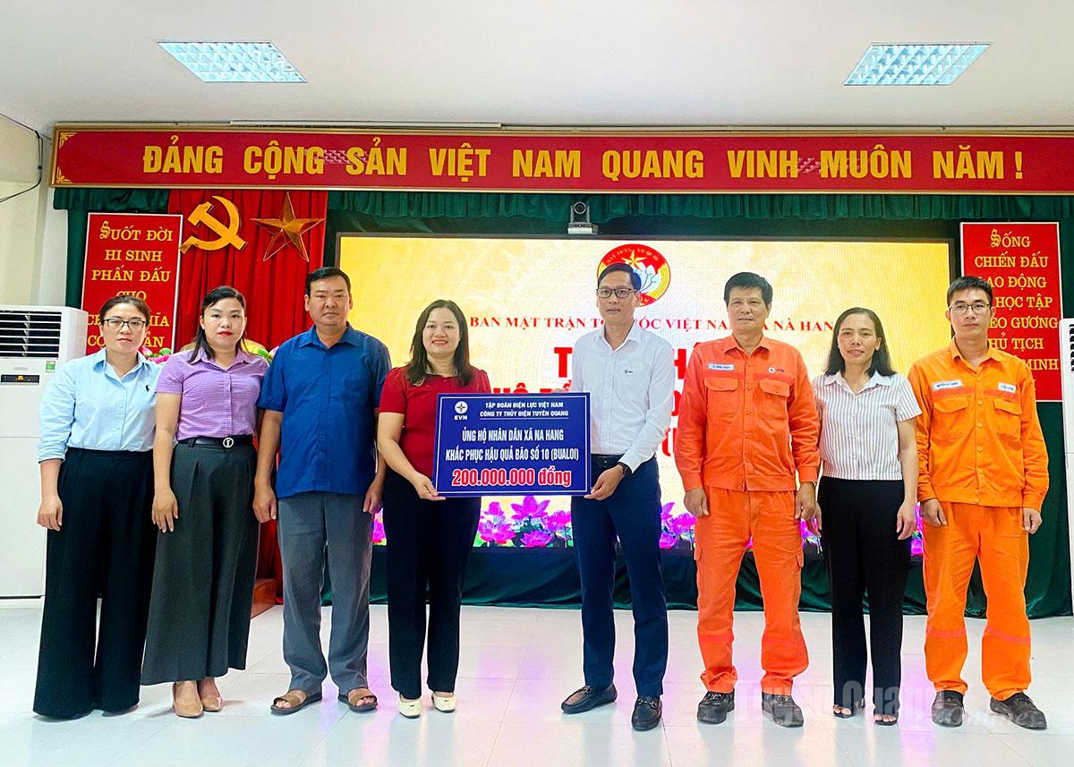 Số tiền trên là sự đóng góp của tập thể lãnh đạo, cán bộ, công nhân Công ty Thủy điện Tuyên Quang, thể hiện tinh thần tương thân tương ái, trách nhiệm của doanh nghiệp đối với cộng đồng. Trước đó, do ảnh hưởng của cơn bão số 10, trên địa bàn xã Nà Hang đã xảy ra mưa lớn, gây lũ quét, sạt lở đất làm thiệt hại nghiêm trọng về tài sản, hoa màu, nhà ở của nhân dân. Toàn xã có 397 hộ bị ảnh hưởng, thiệt hại; gần trên 80 ha lúa, cây màu bị ngập úng. Đặc biệt, các thôn 2, 3, 4, 7, 14 và Tân Lập vốn là “điểm nóng” ngập lụt của xã, được đặt trong tình trạng báo động đỏ. Ước tính thiệt hại trên 555 tỷ đồng. Ngay sau khi tiếp nhận số tiền ủng hộ, Ủy ban MTTQ xã Nà Hang đã có phương án phân bổ nguồn tiền giúp nhân dân nhanh chóng có điều kiện ổn định cuộc sống.