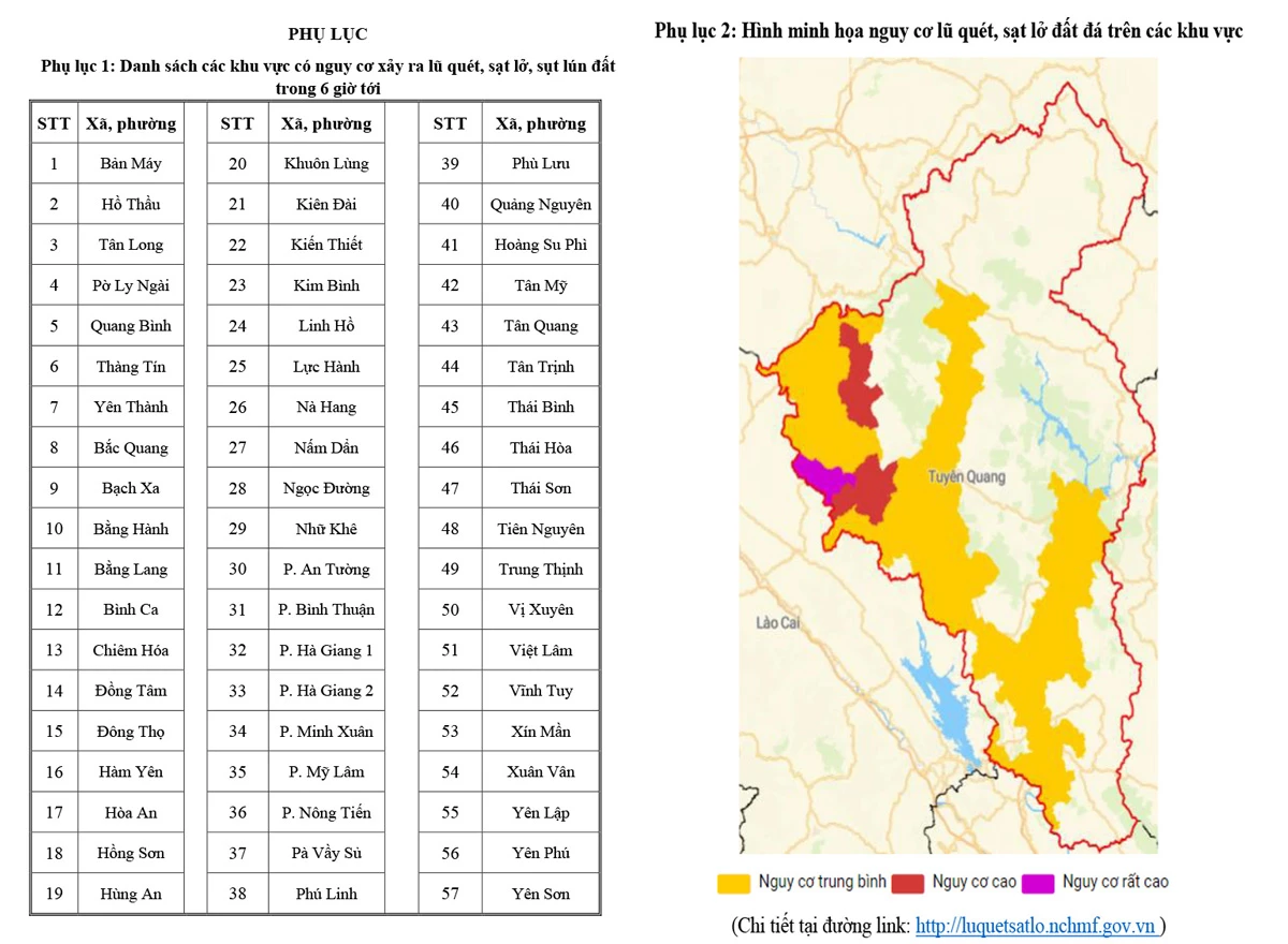 - Trong 6 giờ tới trên địa bàn tỉnh có nguy cơ rất cao xảy ra sạt lở và sụt lún đất nơi có địa hình dốc, khu vực có kết cấu đất đá yếu, kém ổn định, các công trình xây dựng và ngập úng vùng trũng thấp, ven sông suối, ngập úng đô thị.