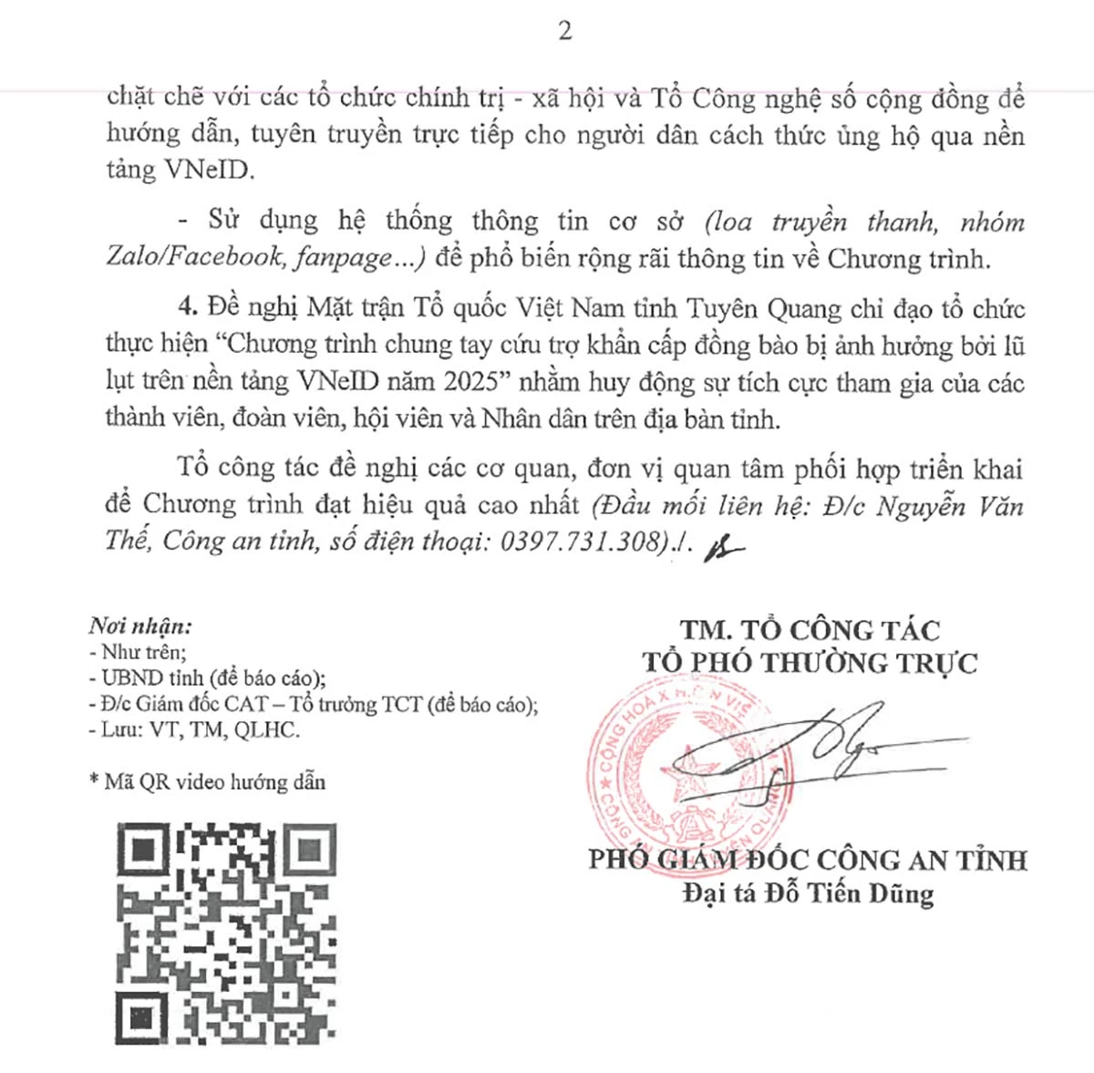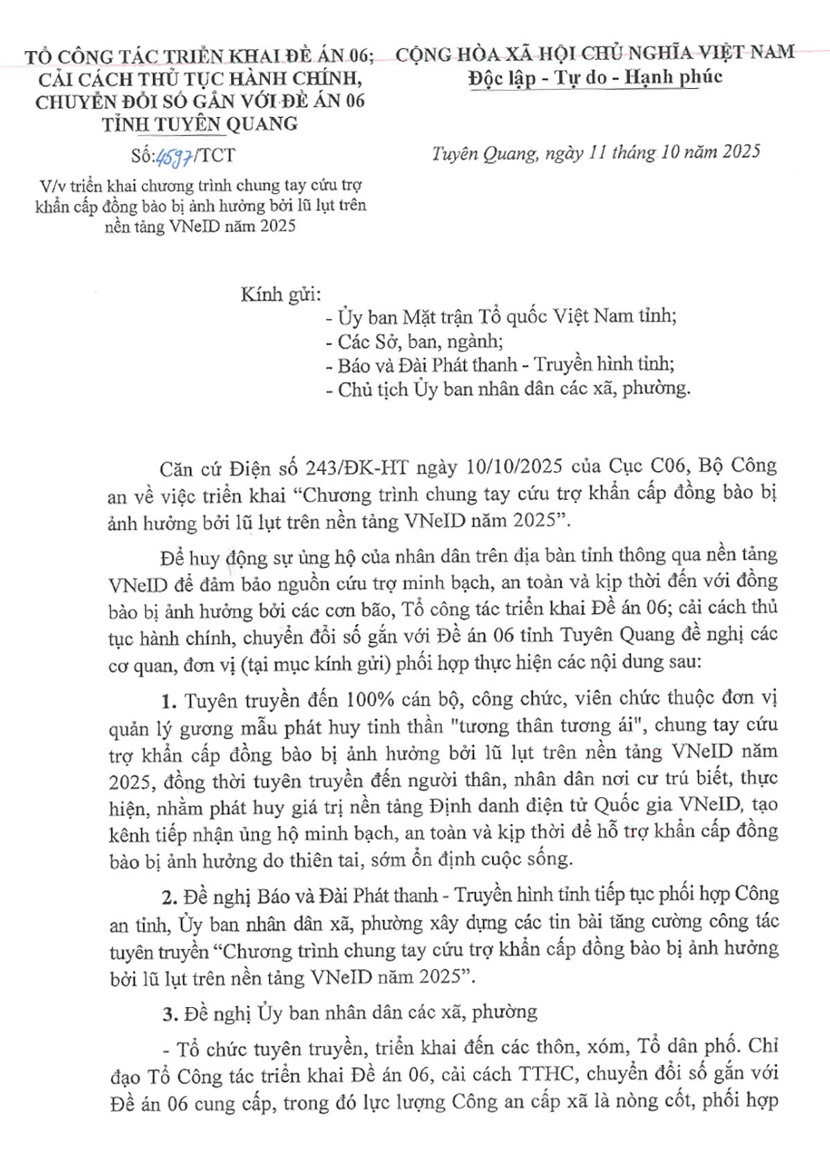 Tổ công tác triển khai Đề án 06 tỉnh Tuyên Quang vừa ban hành văn bản về việc thực hiện chương trình “Chung tay cứu trợ khẩn cấp đồng bào bị ảnh hưởng bởi lũ lụt trên nền tảng VNeID năm 2025”. Chương trình nhằm huy động sự tham gia của cán bộ, người dân trong hoạt động cứu trợ, bảo đảm công khai, minh bạch và kịp thời, đồng thời phát huy hiệu quả ứng dụng nền tảng định danh điện tử quốc gia trong công tác an sinh xã hội.