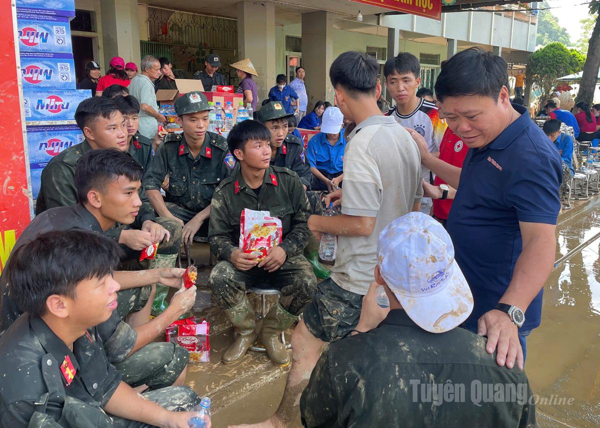 Đồng chí Mai Đức Thông, Tổng Biên tập Báo và phát thanh, truyền hình Tuyên Quang thăm hỏi, động viên các cán bộ, chiến sĩ tham gia công tác khắc phục hậu quả thiên tai tại trường Tiểu học Quang Trung. |