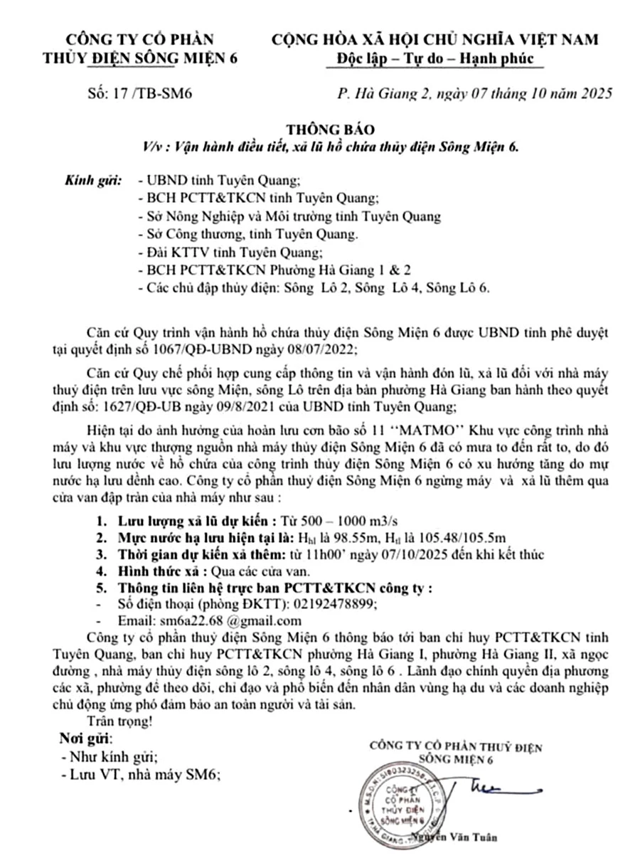 Trước ảnh hưởng của hoàn lưu bão số 11 (MATMO) gây mưa lớn, Công ty cổ phần Thủy điện Sông Miện 6 thông báo vận hành điều tiết, xả lũ hồ chứa để đảm bảo an toàn công trình và hạ du như sau: