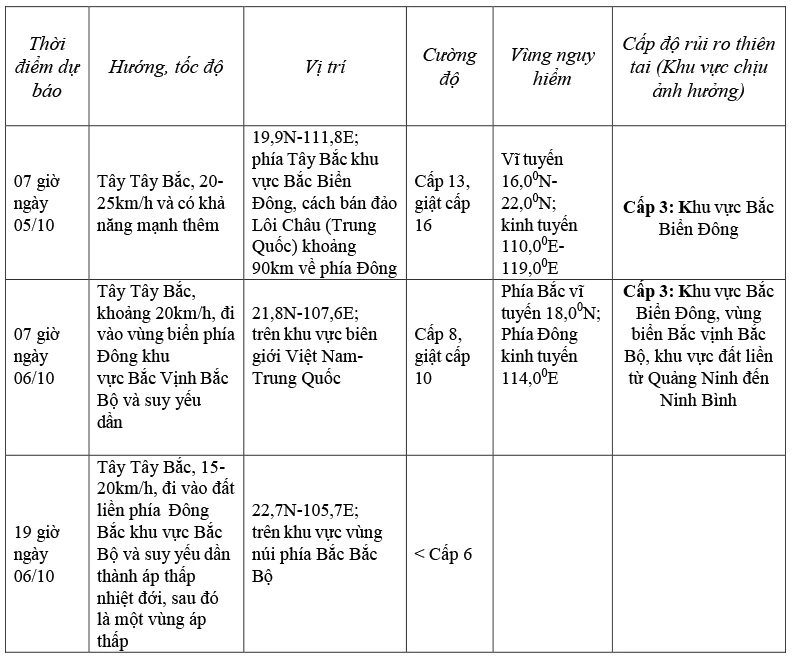 - Từ chiều ngày 05/10, vùng biển phía Đông khu vực Bắc Vịnh Bắc Bộ (bao gồm đặc khu Bạch Long Vĩ) có gió mạnh dần lên cấp 6-7, sau tăng lên cấp 8-9. Từ tối ngày 05/10, khu vực Bắc vịnh Bắc Bộ (bao gồm đặc khu Bạch Long Vỹ, Vân Đồn, Cô Tô, Cát Hải và đảo Hòn Dấu) gió mạnh dần lên cấp 8-9, sóng biển cao 2,0-4,0m, vùng gần tâm bão