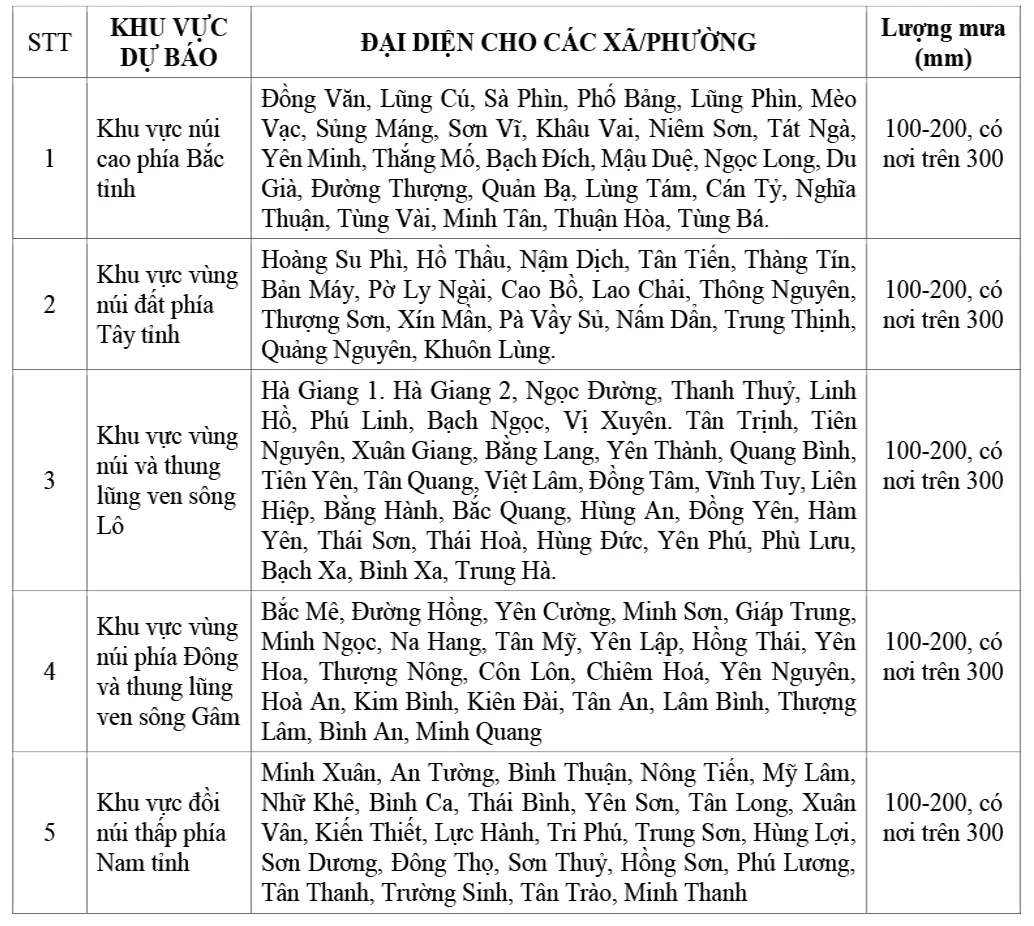 Mưa lớn: Đêm ngày 05/10 các khu vực có mưa rào và dông rải rác; từ sáng ngày 06/10 đến hết đêm 07/10 trên địa bàn tỉnh Tuyên Quang có mưa to đến rất to và rải rác có dông. Lượng mưa phổ biến từ 100-200mm/đợt, có nơi trên 300mm/đợt. Cảnh báo mưa cường suất lớn (>100mm/3h). Hoàn lưu bão số 11 tương đối rộng, cần đề phòng khả năng xảy ra lốc, sét và gió giật mạnh cả trước và trong bão.