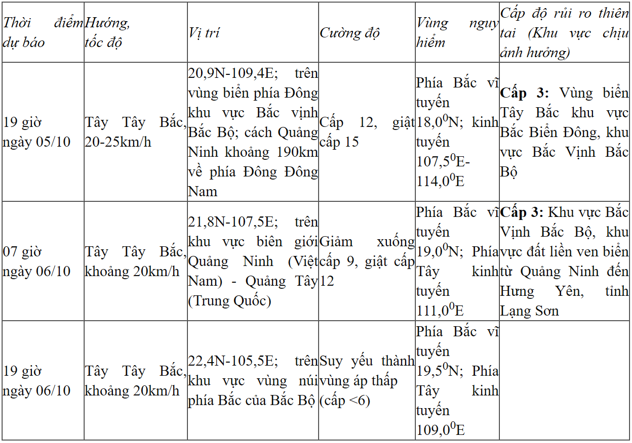 - Từ chiều ngày 05/10, vùng biển phía Đông khu vực Bắc vịnh Bắc Bộ (bao gồm đặc khu Bạch Long Vĩ) có gió mạnh dần lên cấp 6-7, sau tăng lên cấp 8-9. Từ chiều tối ngày 05/10, khu vực Bắc vịnh Bắc Bộ (bao gồm đặc khu Bạch Long Vỹ, Vân Đồn, Cô Tô, Cát Hải và đảo Hòn Dấu) có gió mạnh dần lên cấp 8-10, sóng biển cao 2,0-4,0m, vùng gần tâm bão đi qua cấp 11-12, giật cấp 15, sóng biển cao 3,0-5,0m, biển động dữ dội (rất nguy hiểm đối với tàu thuyền). -