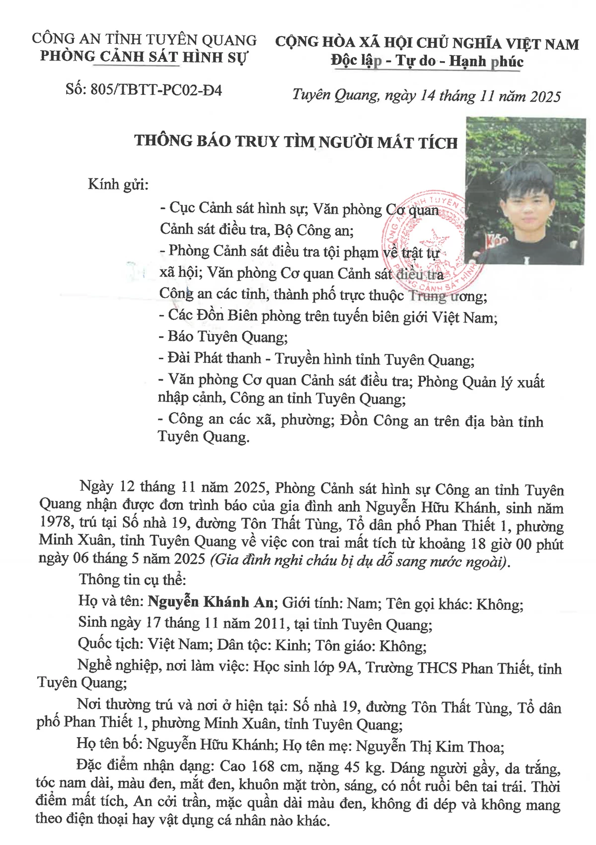 Ngày 12 tháng 11 năm 2025, Phòng Cảnh sát hình sự Công an tỉnh Tuyên Quang nhận được đơn trình báo của gia đình anh Nguyễn Hữu Khánh, sinh năm 1978, trú tại Số nhà 19, đường Tôn Thất Tùng, Tổ dân phố Phan Thiết 1, phường Minh Xuân, tỉnh Tuyên Quang về việc con trai mất tích từ khoảng 18 giờ 00 phút ngày 06 tháng 5 năm 2025 (Gia đình nghi cháu bị dụ dỗ sang nước ngoài) .