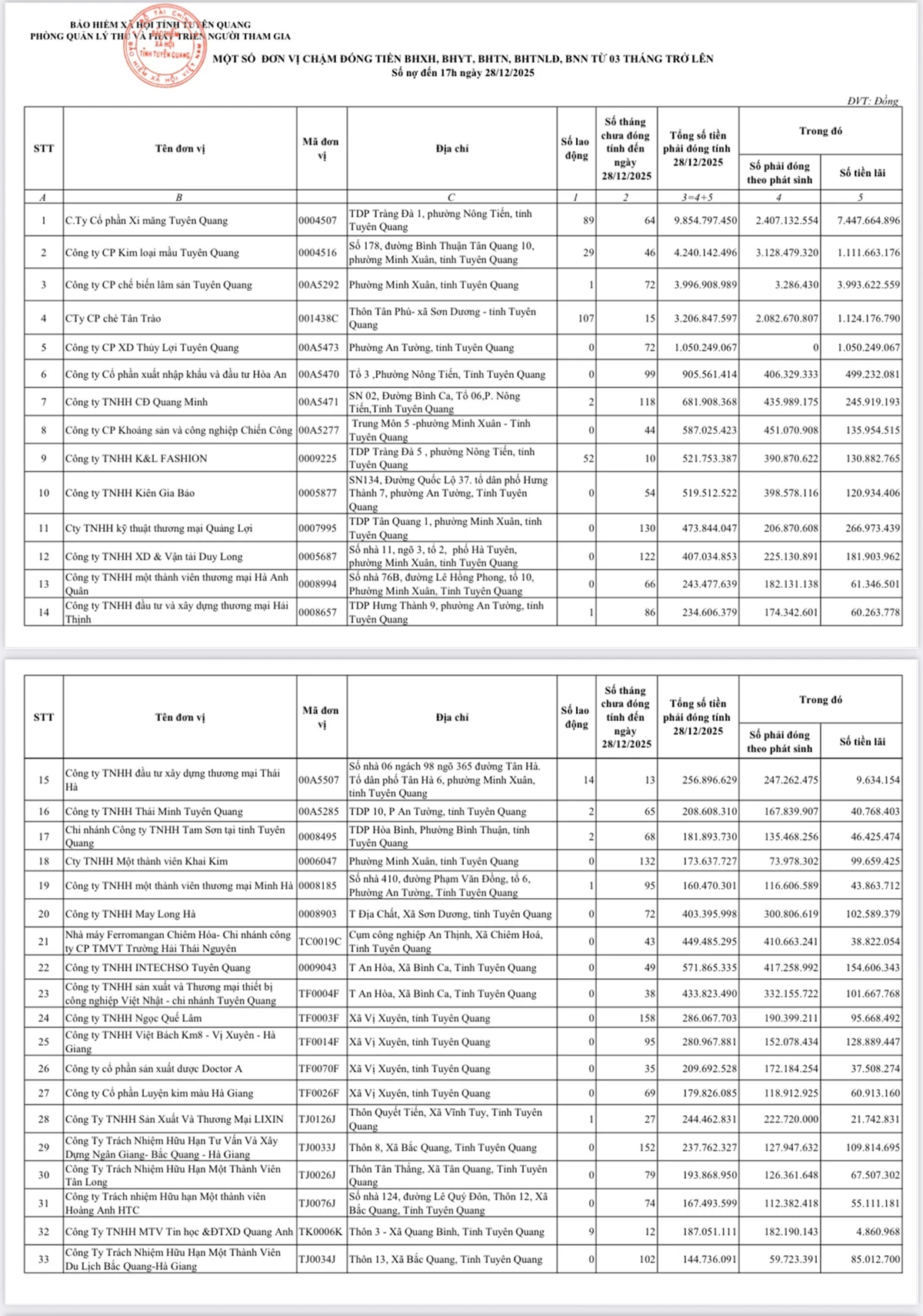 Hiện trên địa bàn tỉnh còn nhiều đơn vị chưa thực hiện trích đóng BHXH, BHYT, BHTN, trong đó có một số doanh nghiệp chậm đóng kéo dài với số tiền chậm đóng lớn. BHXH tỉnh phối hợp với Báo và phát thanh, truyền hình Tuyên Quang công khai danh sách 50 đơn vị chậm đóng BHXH, BHYT, BHTN từ 3 tháng trở lên (số liệu do BHXH tỉnh Tuyên Quang cung cấp đến ngày 28-12-2025).