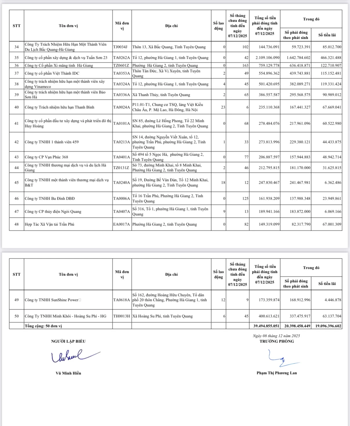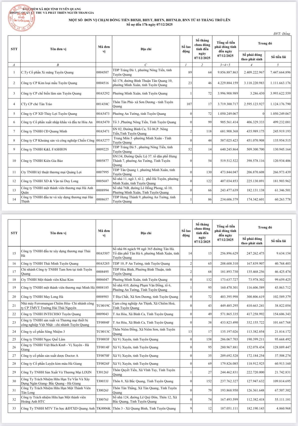 Hiện trên địa bàn tỉnh còn nhiều đơn vị chưa thực hiện trích đóng BHXH, BHYT, BHTN, trong đó có một số doanh nghiệp chậm đóng kéo dài với số tiền chậm đóng lớn. BHXH tỉnh phối hợp với Báo và phát thanh, truyền hình Tuyên Quang công khai danh sách 50 đơn vị chậm đóng BHXH, BHYT, BHTN từ 3 tháng trở lên (số liệu do BHXH tỉnh Tuyên Quang cung cấp đến ngày 7-12-2025).