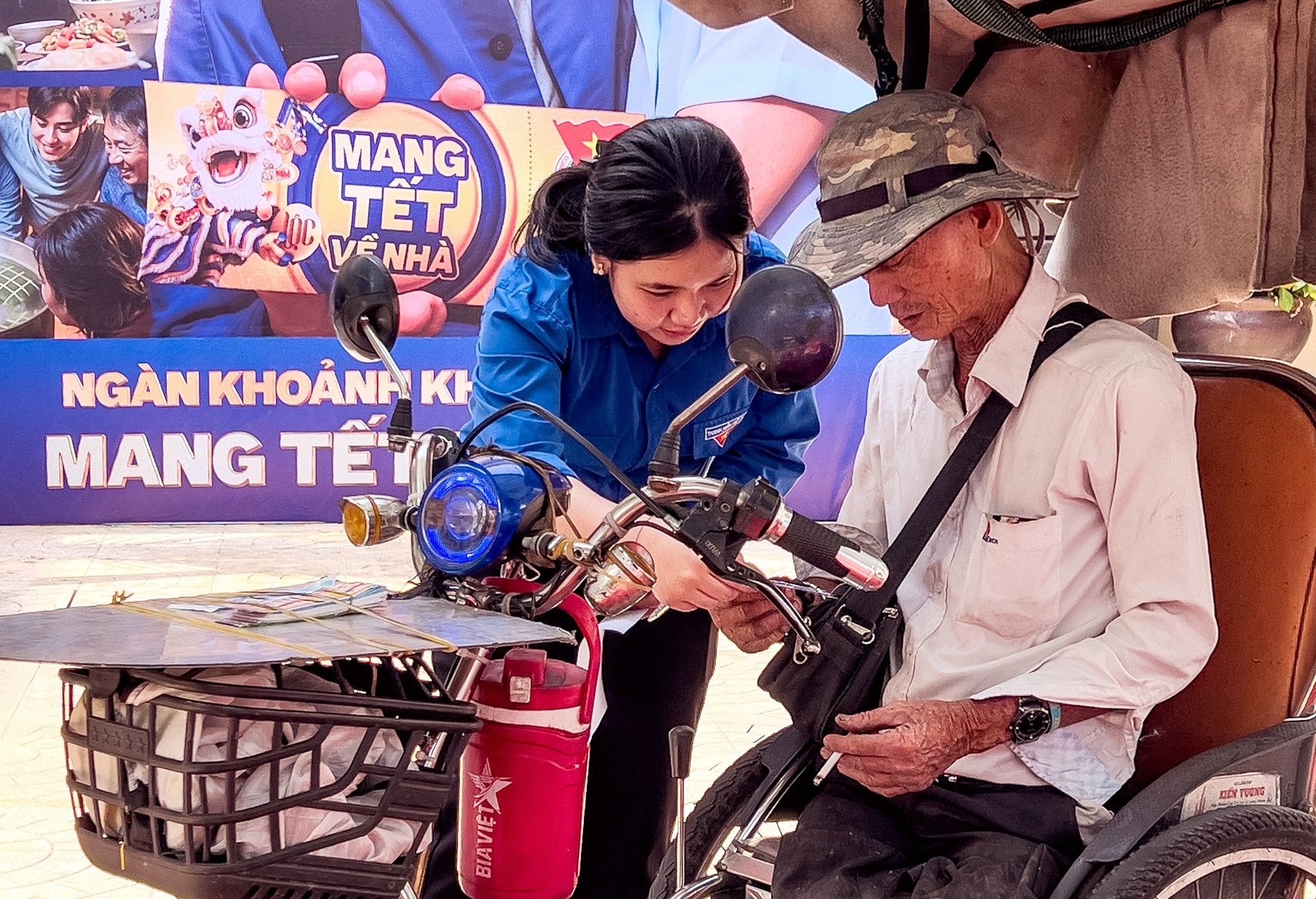 | Một người khuyết tật vận động được nhận tấm vé về quê ăn Tết. Ảnh: BTC |
