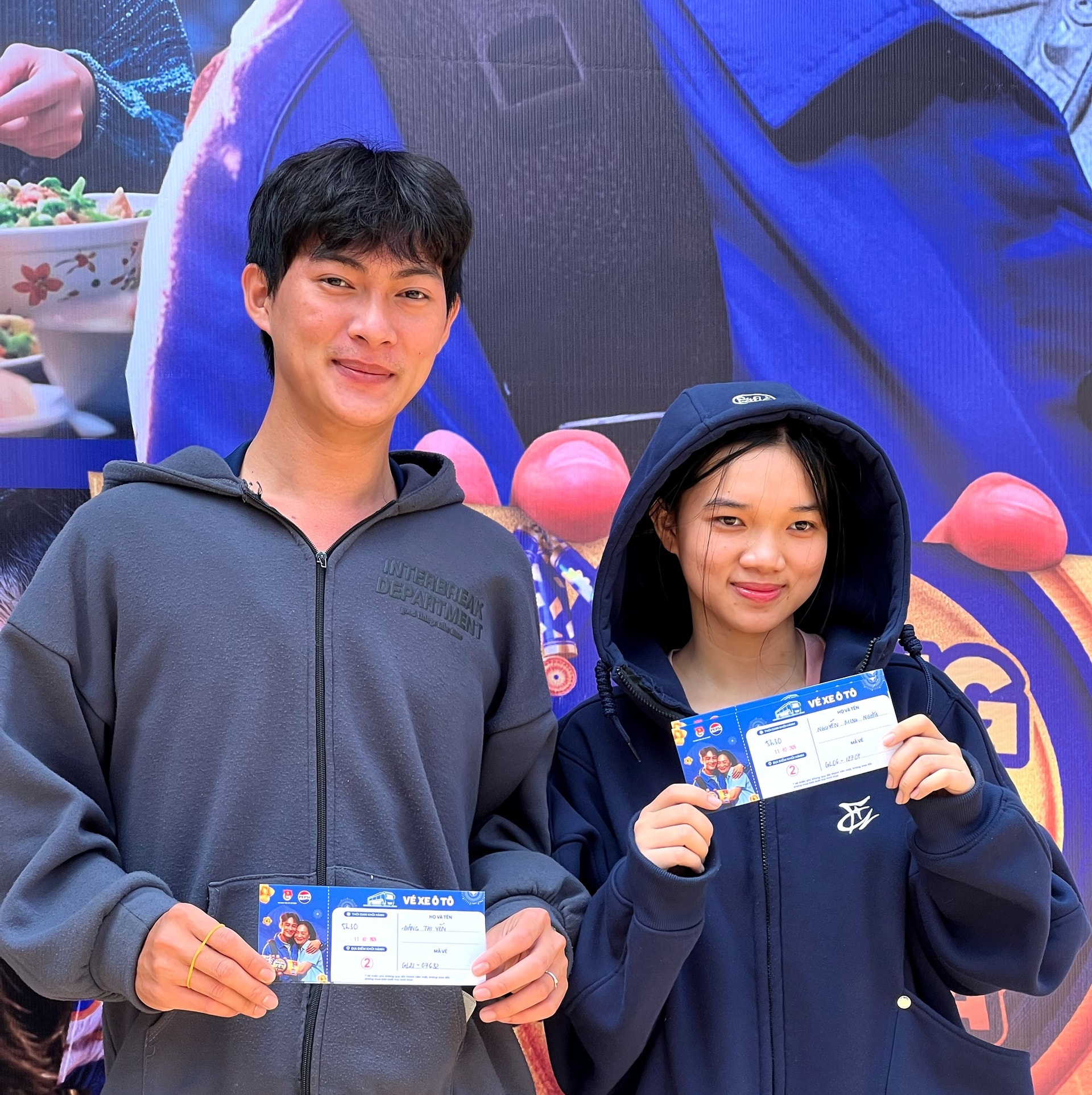 | Hai bạn sinh viên có hoàn cảnh khó khăn vui mừng khi được nhận vé xe về quê dịp Tết. Ảnh: BTC |