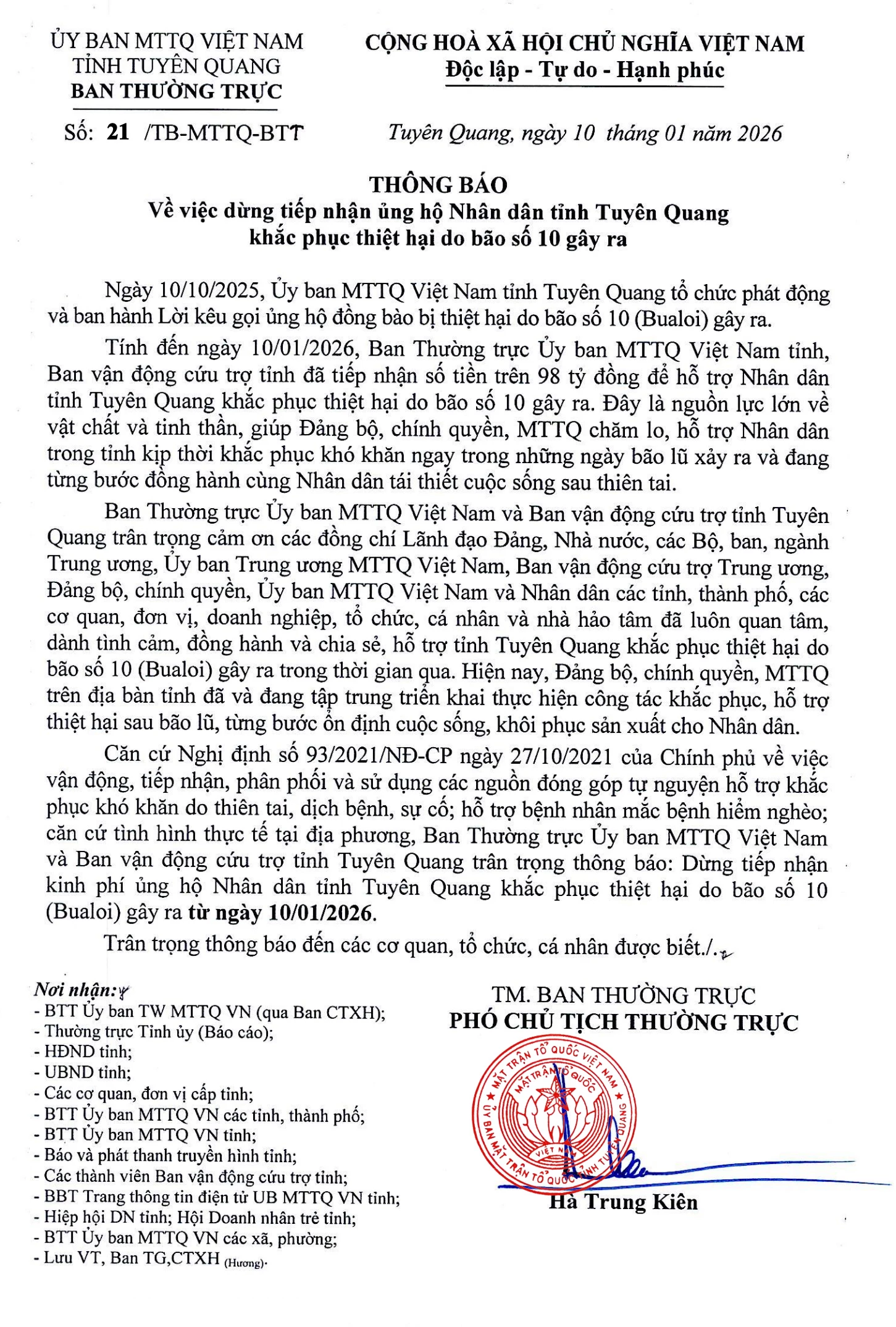 Thông báo về việc dừng tiếp nhận ủng hộ Nhân dân tỉnh Tuyên Quang khắc phục thiệt hại do bão số 10 gây ra