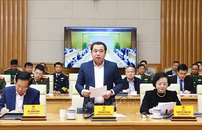 | Bộ trưởng Bộ Nông nghiệp và Môi trường Trần Đức Thắng báo cáo tổng kết “Chiến dịch Quang Trung” xây dựng lại nhà cho các gia đình bị thiệt hại do bão lũ tại miền Trung. Ảnh: Dương Giang/TTXVN |