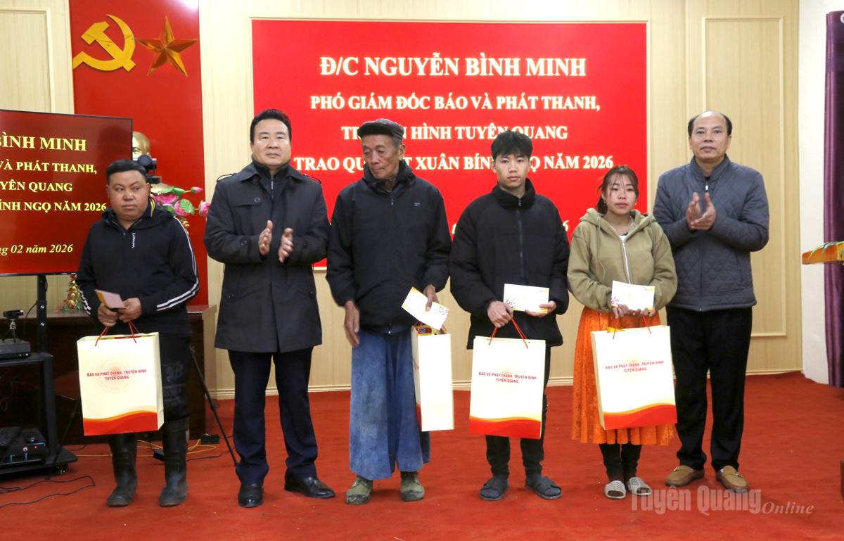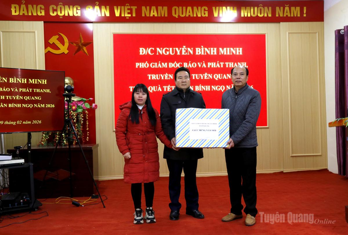Nhân dịp Tết Nguyên đán Bính Ngọ 2026, Phó Giám đốc Báo và phát thanh, truyền hình Tuyên Quang Nguyễn Bình Minh tặng 10 suất quà cho gia đình chính sách và các đơn vị, đồng thời gửi lời chúc mừng năm mới an khang, thịnh vượng tới cán bộ, đảng viên và gia đình chính sách các địa phương. Đồng chí mong muốn cấp ủy, chính quyền tiếp tục phát huy tinh thần đoàn kết, triển khai hiệu quả các nhiệm vụ ngay từ đầu năm, giữ vững quốc phòng - an ninh, từng bước nâng cao đời sống Nhân dân.