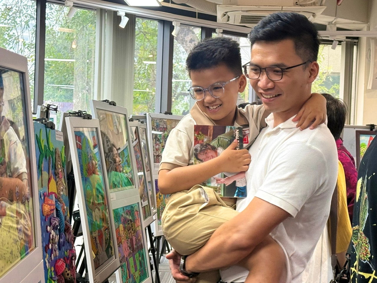 | Phạm Minh An, lớp 1A2, Trường Tiểu học, THCS và THPT Ngôi Sao Hoàng Mai, Hà Nội, và bố Phạm Minh Đức cùng ngắm những bức vẽ trẻ thơ. Ảnh: Kiều Thoan Thu |
