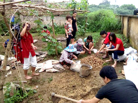 Các thành v iên nhóm 8X Hà Giang trồng gừng vào bao tải tại Trung tâm Bảo trợ xã hội tỉnh. Ảnh: Nhóm 8X cung cấp