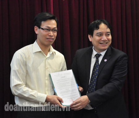 Bí thư thứ nhất BCH Trung ương Đoàn Nguyễn Đắc Vinh trao quyết định cho đ/c Lê Quang Tự Do.