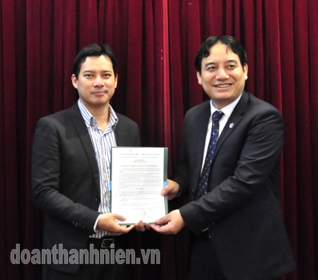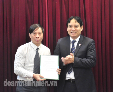 Bí thư thứ nhất BCH Trung ương Đoàn Nguyễn Đắc Vinh trao quyết định cho đ/c Lê Quang Tự Do.