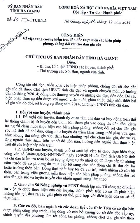 HGĐT- Ngày 12.12, Báo Hà Giang Điện tử nhận được Công điện số 13/CĐ-CTUBND của UBND tỉnh về việc tăng cường kiểm tra, đôn đốc thực hiện các biện pháp phòng, chống đói rét cho đàn gia súc. Báo Hà Giang Điện tử đăng toàn văn Công điện.