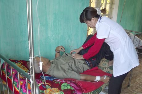 Cán bộ y tế xã chăm sóc sức khỏe người bệnh.